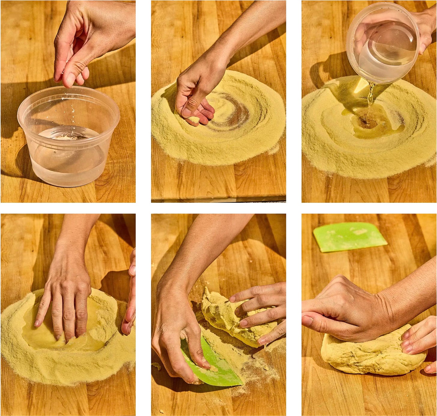 Pour your semolina onto your work surface and make a well in the center. Slowly pour in the water, and using your fingertips, slowly incorporate it into the flour and form a shaggy dough.