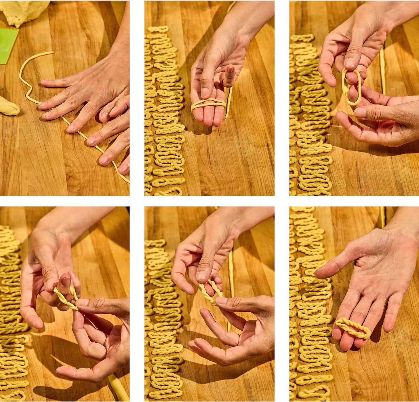 Wrap the dough around three fingers two times, then pinch and roll the ends together to seal. Carefully twist the looped dough three times to form the signature twisted ring shape.