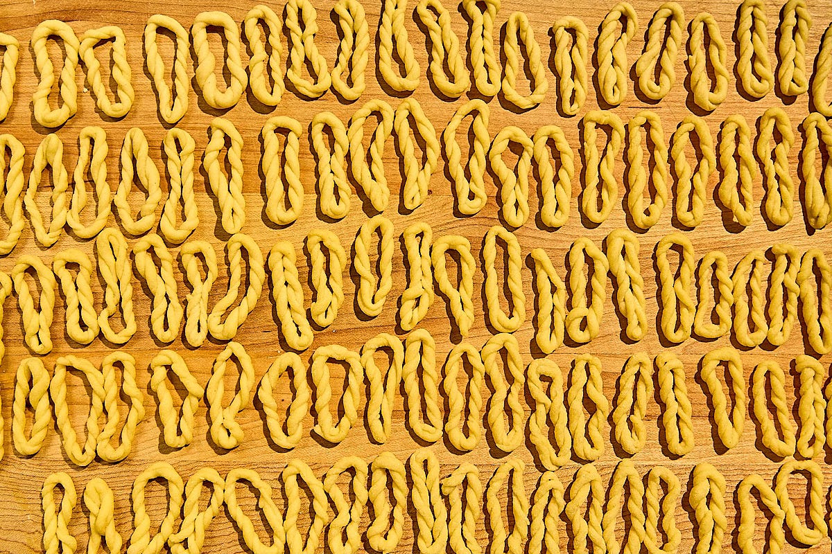 Bring a large pot of salted water to a boil. Add your lorighittas and cook until al dente — anywhere from 8 to 12 minutes. It will really depend on how thin or thick you rolled them. Check for doneness every few minutes.